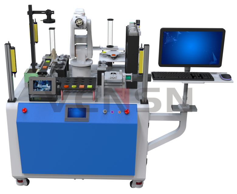 另外,还在台架上设置了桌面式运输模块,通过上料模块的输入,采用传感器探测物流的运输位置,然后通过2D和3D视觉模块,实现对物料的平面或立体特征的提取,驱动机器人完成不同的任务。此外,针对动态旋转目标,机架上设置了旋转送料机构,机器人动态抓取目标后,通过工业视觉系统对物料底部进行扫描,获得工件的表面特征,最后检测识别后根据任务需求做出各类执行动作。