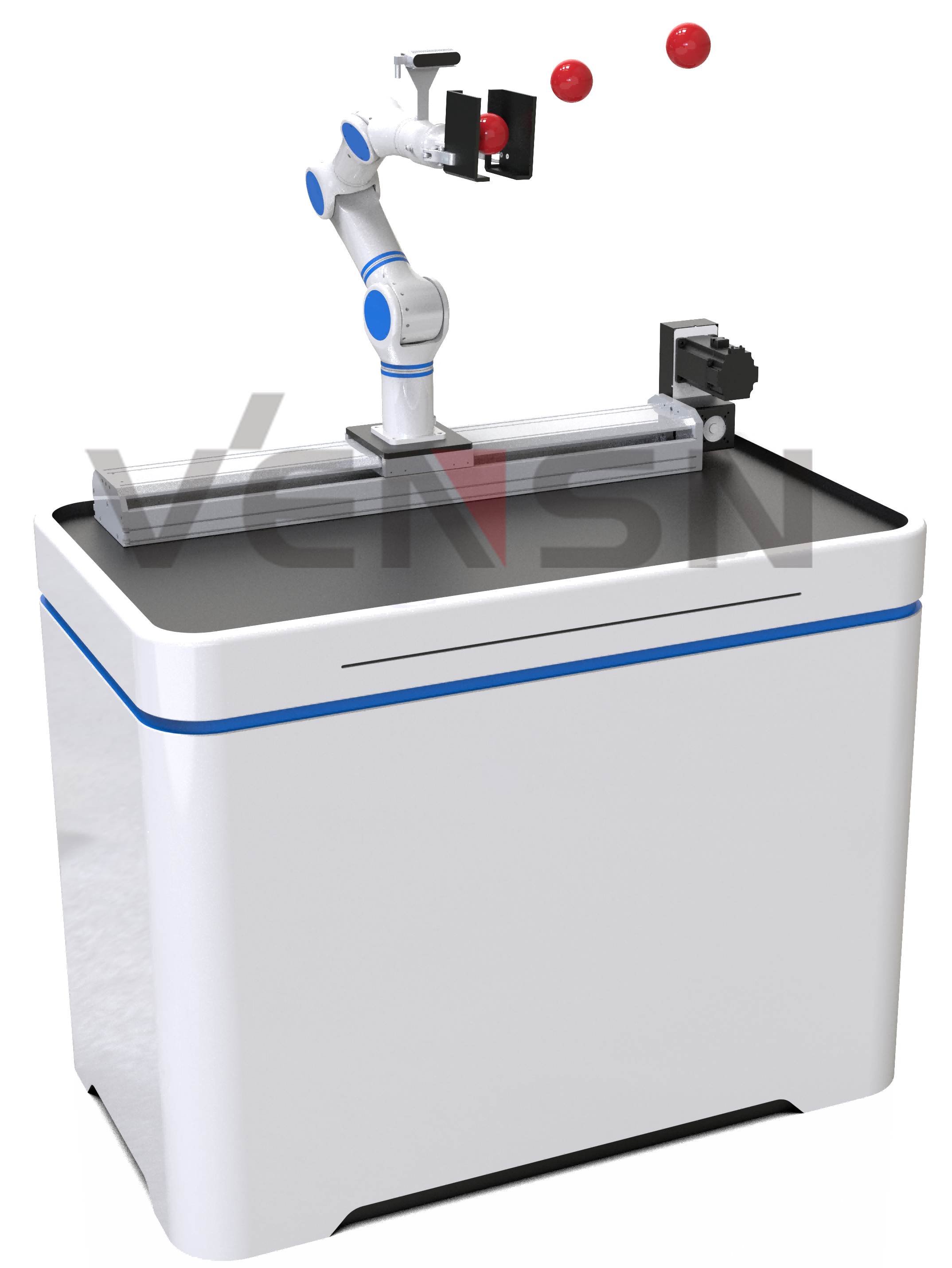(13)具备机器人空中动态目标实时捕获功能:手臂可根据视觉系统反馈的目标轨迹和距离,实时控制移动导轨的运动方向,并调节手臂末端的空间姿态,当目标到达手臂末端时,可自动捕获目标物体,支持捕获如乒乓球、网球、皮球等不少于三种弹性物体。