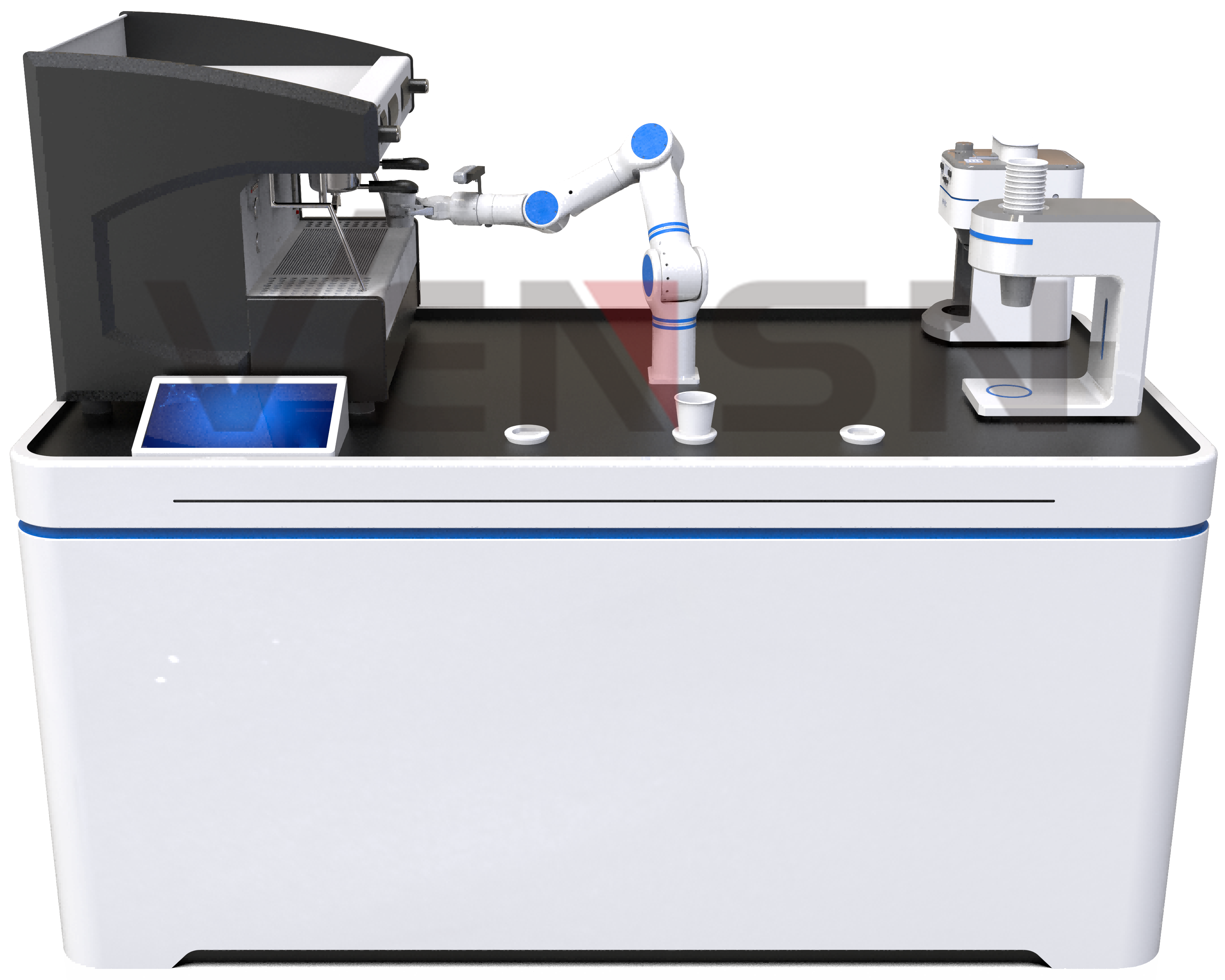 (2)平台上方安装有七轴手臂、咖啡机、牛奶机、纸杯存储单元、显示屏等设备,可实现全自动的咖啡制作流程;