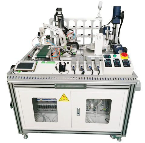 实训台由立体仓储单元、转台模拟加工单元、视觉检测单元、搬运单元、流水线单元、次品分拣单元、电气控制箱等组成。配备PLC主控模块、HMI触摸屏、电源模块、驱动模块、人机交互模块等,包含步进电机驱动、减速电机驱动器、变频器、气缸,及光电传感器、金属接近传感器、编码器等各类常用传感器。