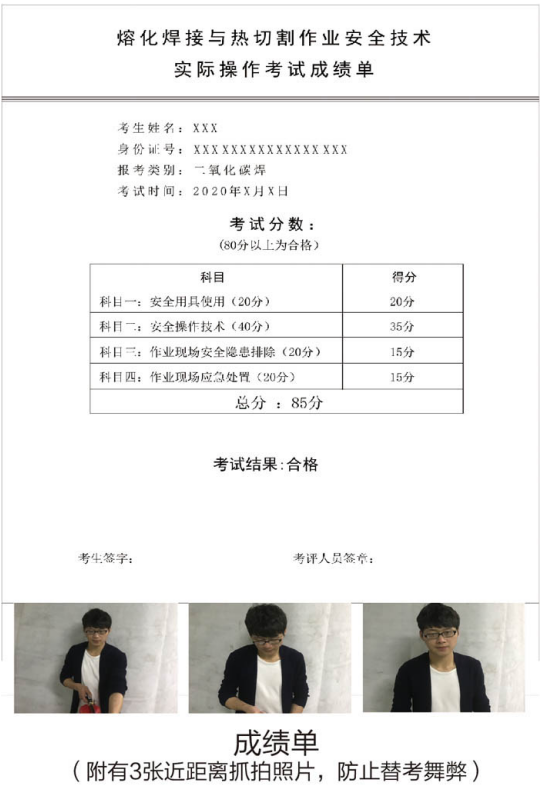 智能化、人性化程度较高,考生根据考核流程完成考试操作,系统根据《熔化焊接与热切割作业安全技术实际操作考试标准》内的评分标准,自动对考生操作进行评分。然后可即时打印出成绩单。