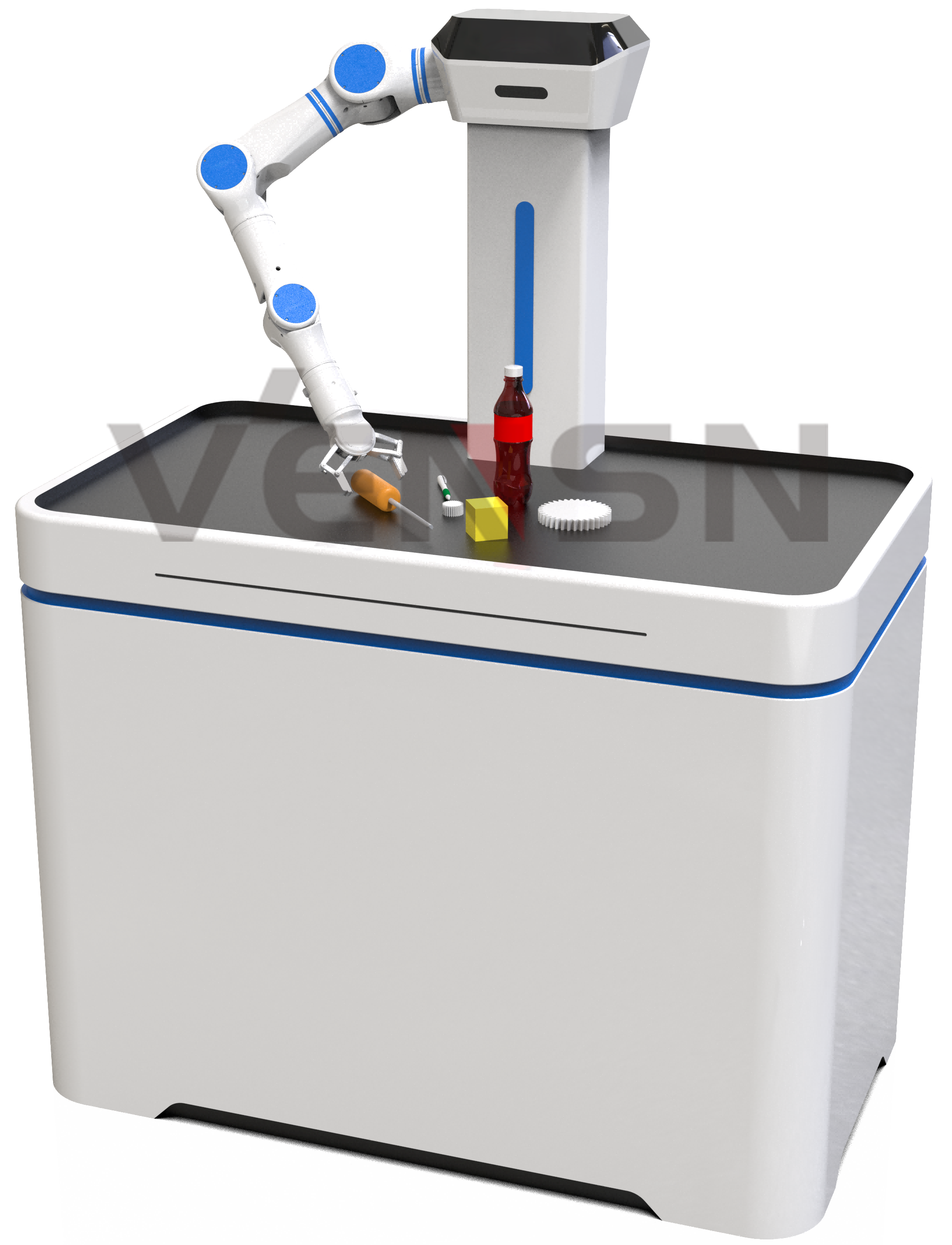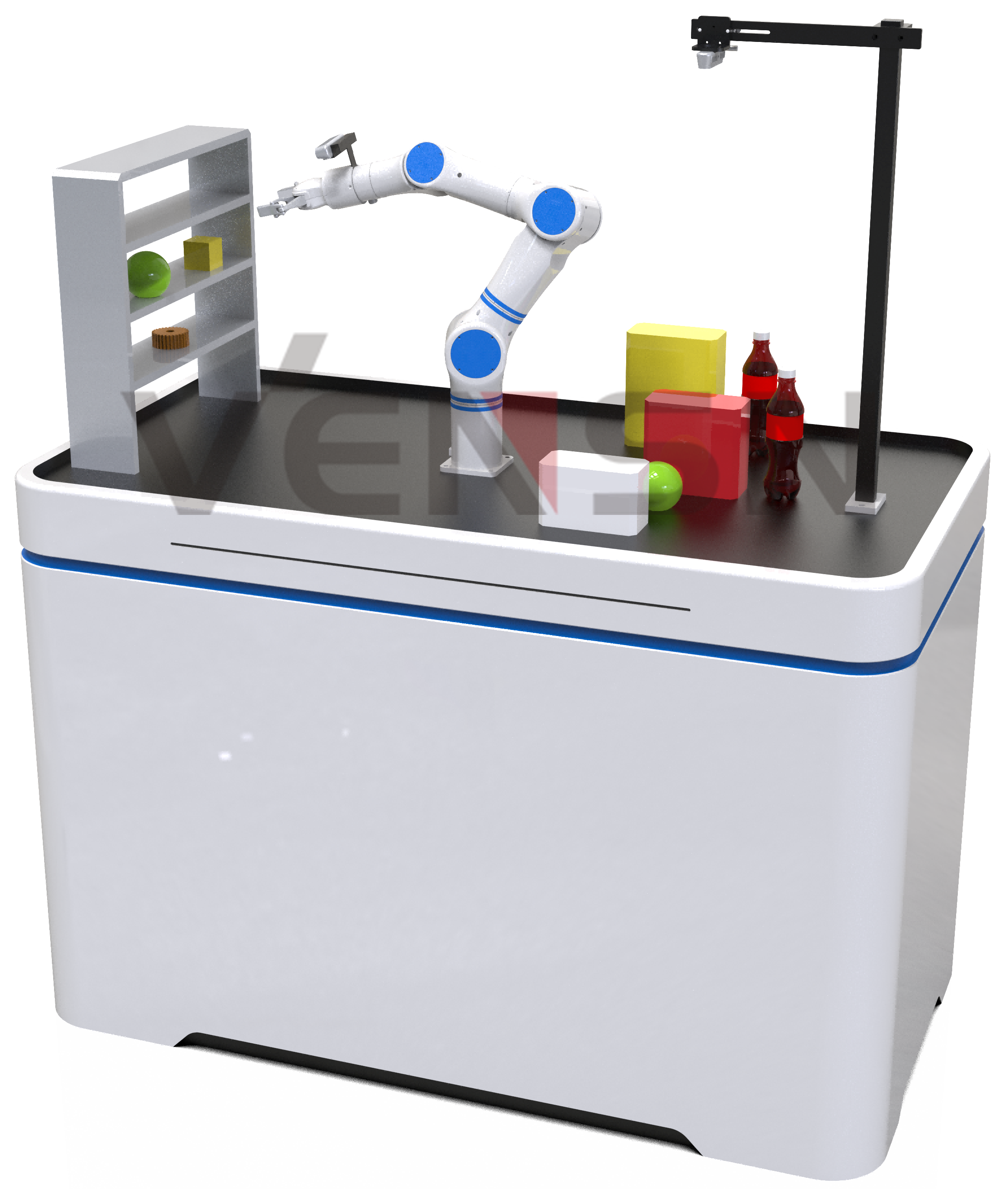 (2)平台上方安装有七轴手臂、咖啡机、牛奶机、纸杯存储单元、显示屏等设备,可实现全自动的咖啡制作流程;