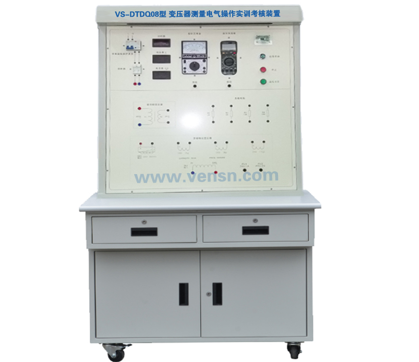 VS-DTDQ08型 变压器测量电气操作实训考核装置设有变压器原理电路所需要的单绕组变压器、多绕组变压器、电阻器等器件并采用安全接线柱引出端子,同时把电路检测常用到的指针万用表和数字万用表装嵌到实训台上,学生可通过安全连接线直接接插设计构建变压器工作原理电路,并利用指针万用表和数字万用表两种常用仪表来测验变压输入输出电路参数加以验证实训,通过本实训台的训练可以让学生学会的单绕组变压器、多绕组变压器电路设计装接技能,快速了解单绕组变压器、多绕组变压器的工作原理,学会运用两种万用表正确测量单绕组变压器、多绕组变压器参数。