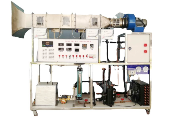 制冷压缩机组,冷凝器,蒸发器,离心风机,电热加湿装置,一次、二次加热装置,数显温度仪表,压差计(±100),超压保护装置,压力表(-0.1-2.5 Mpa),转子流量计,热电偶,电流表,电压表,风量测量装置(笛形管),不锈钢台架及控制屏等。