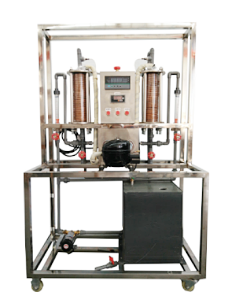 采用透明耐压玻璃作壳体的压缩机、盘管蒸发器、盘管冷凝器。循环水泵,玻璃转子流量计,调节阀门组、PVC板冷却水箱;测试系统由8路万能信号输入液晶显示巡检仪、PT100热电偶组成;有工作台架可随时移动。