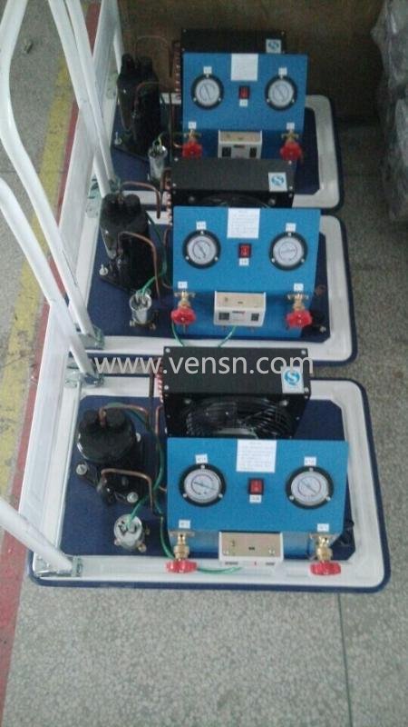 3、整个装置采用模块化设计,学生在空调实训中可利用空调中的制冷剂回收,重复使用,可节省大量的社训成本。