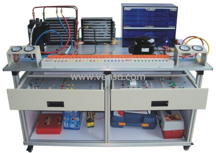 2、导轨式铝合金安装平台由标准规格的铝合金工业型材组成,作为学生操作训练的平台,上面安装有空调系统部件和冰箱系统部件。