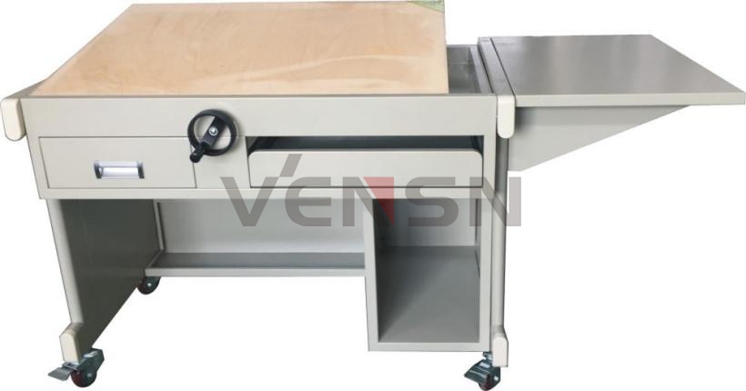 桌面可调节倾角、桌子侧面折叠板翻开可放置仪器、工具,下面抽屉供放学习资料、工具书等。